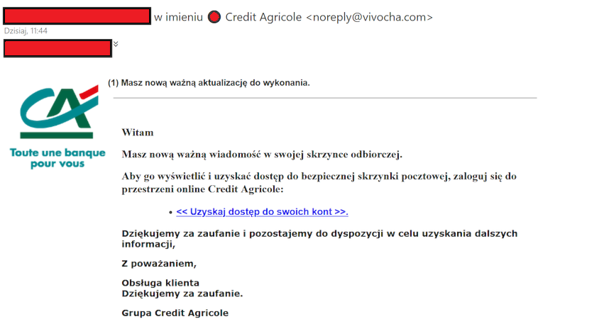 - Atak na klientów ING Bank Śląski, z informacją o "zablokowaniu" konta bankowego, w mailu podany link do odblokowania konta który wiedzie do fałszywej strony banku. Pełna treść informacji dostępna na stronie banku. Przykładowy wygląd maila ze strony banku:
